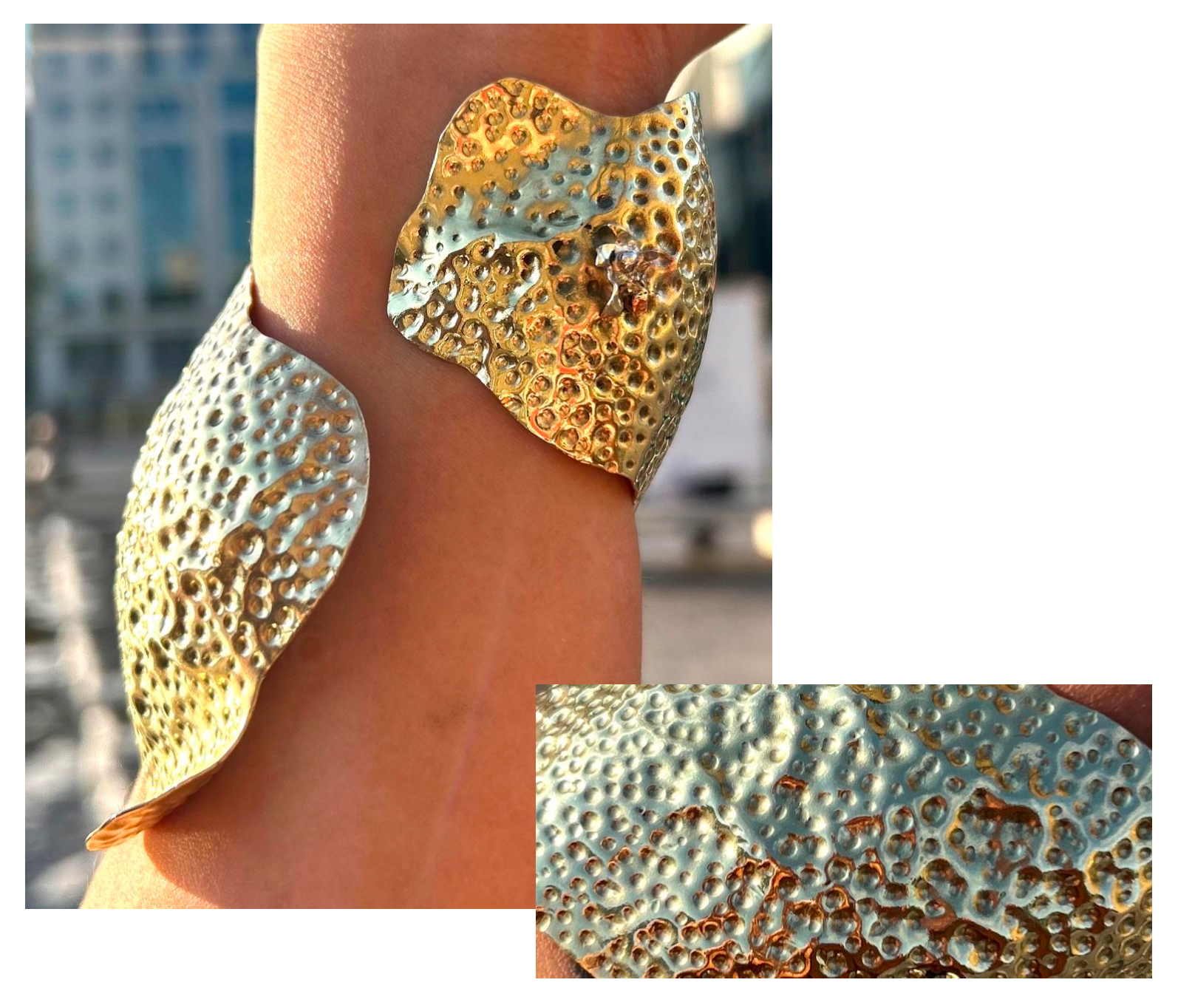Hand-forged and punched ‘orange peel’ bracelet with silver stem detail